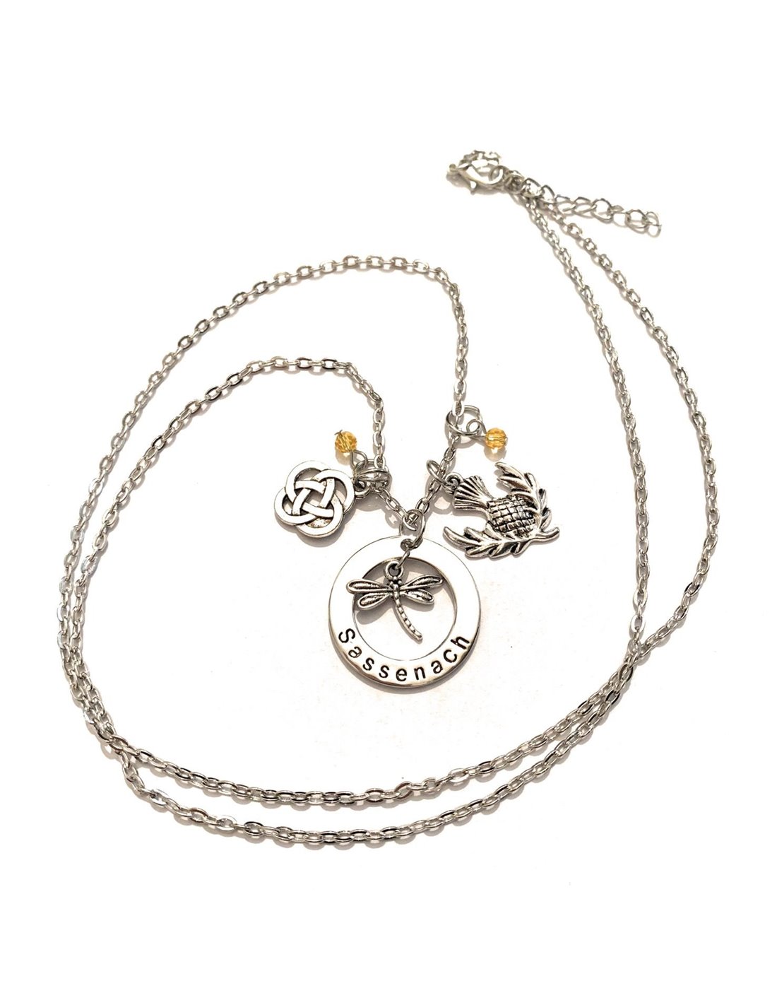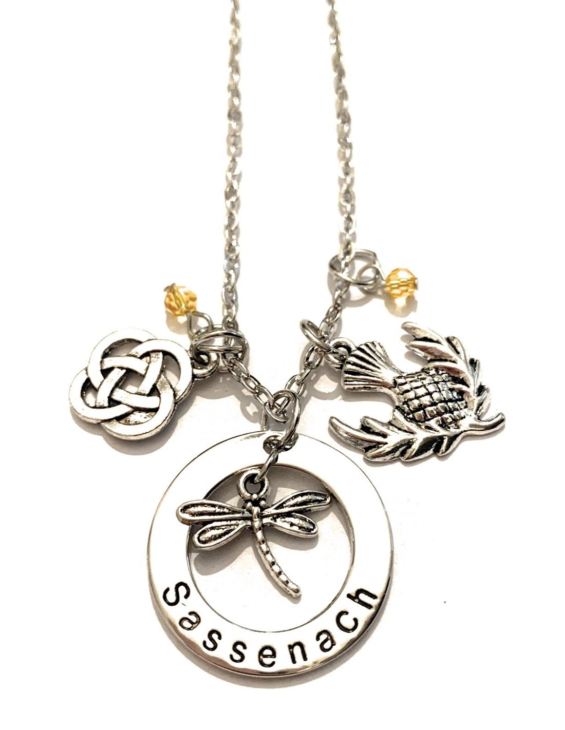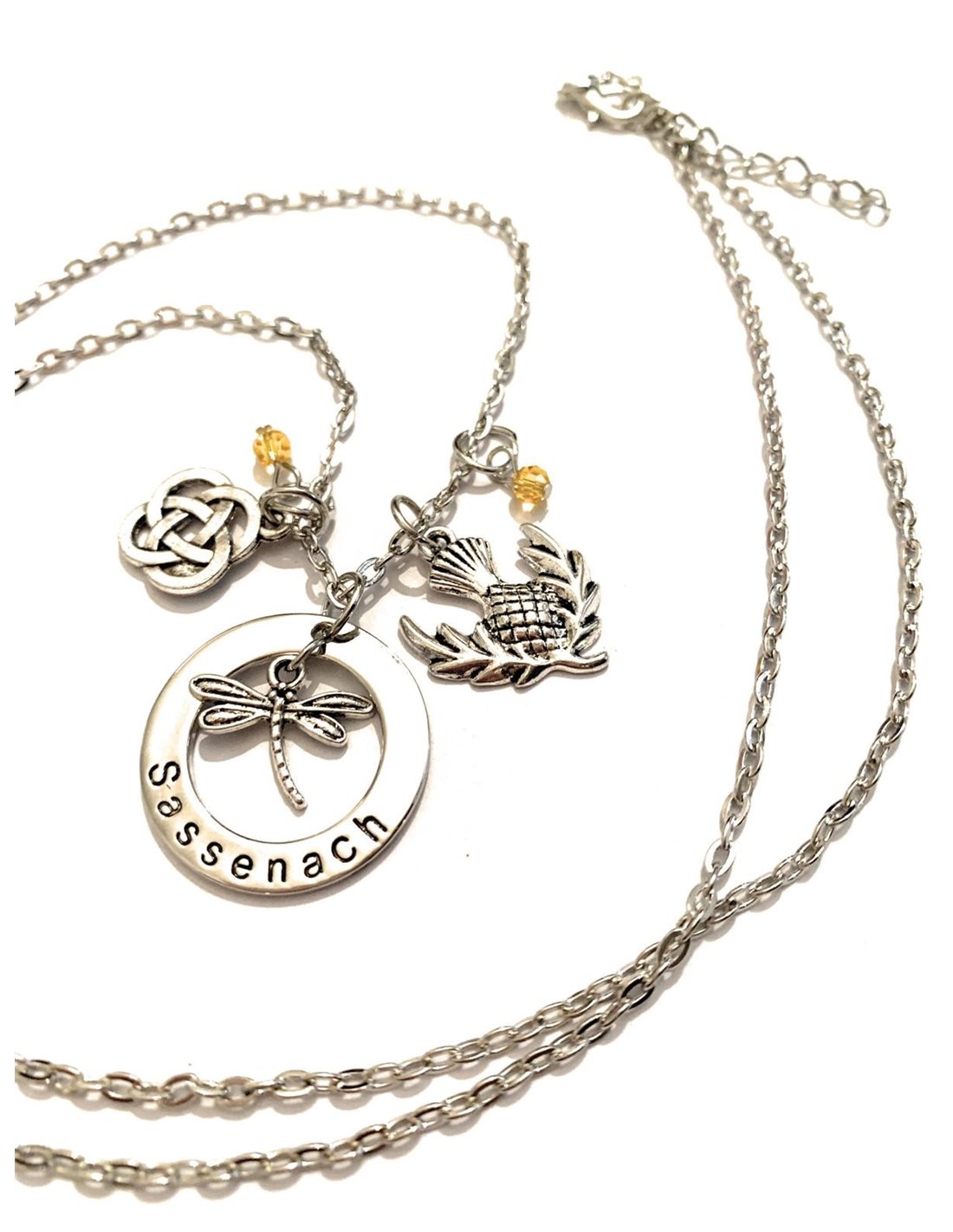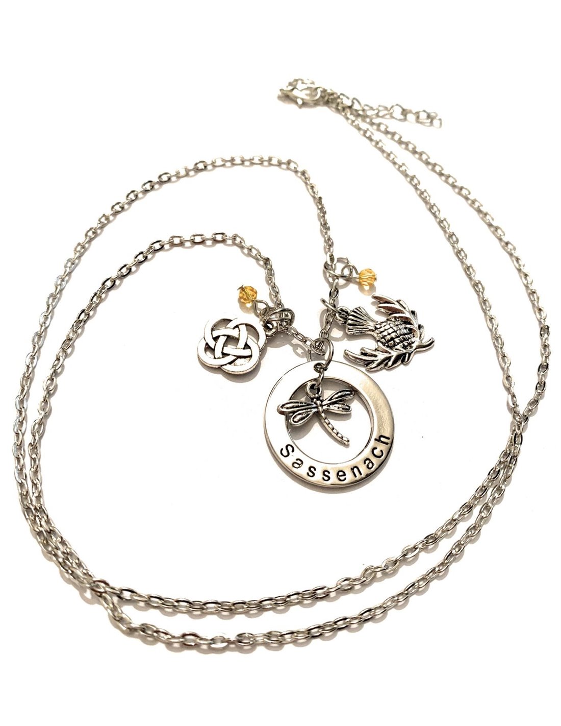 Collana incisione Sassenach, il nodo scozzese, la libellula ed il fiore cardo, fiore perenne molto forte e rude, simbolo della Scozia!
