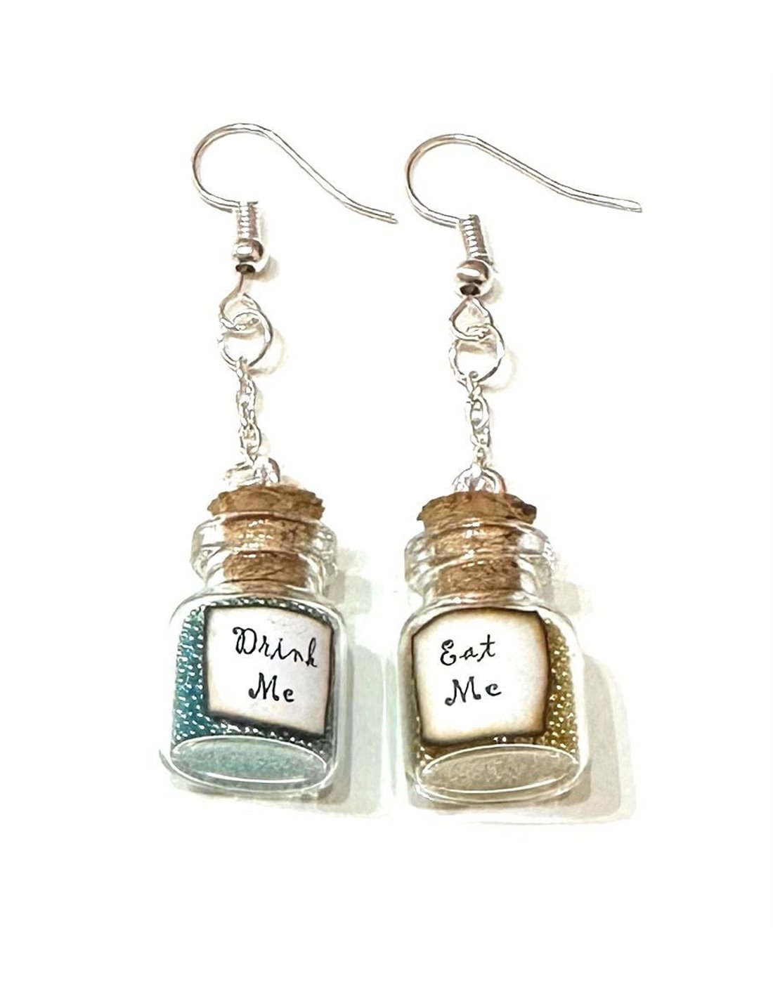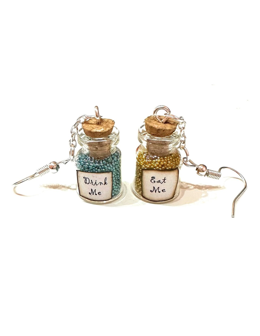 Orecchini pendenti con mini boccette "Drink me & Eat Me", ispirate al film d'animazione della nostra infanzia -