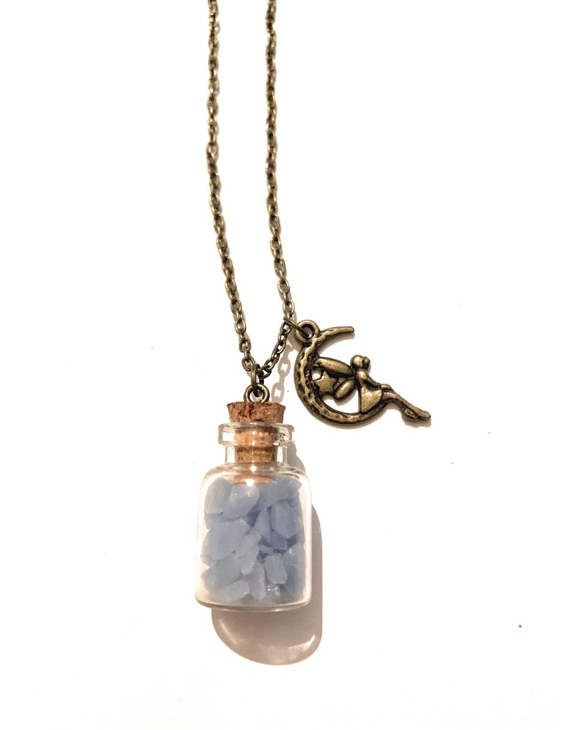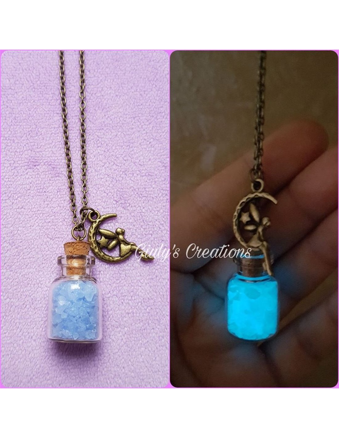 - La collana è costituita da una boccetta in vetro con contenuto GLOW IN THE DARK (che si illumina al buio) a rappresentare la polvere fatata della fatina