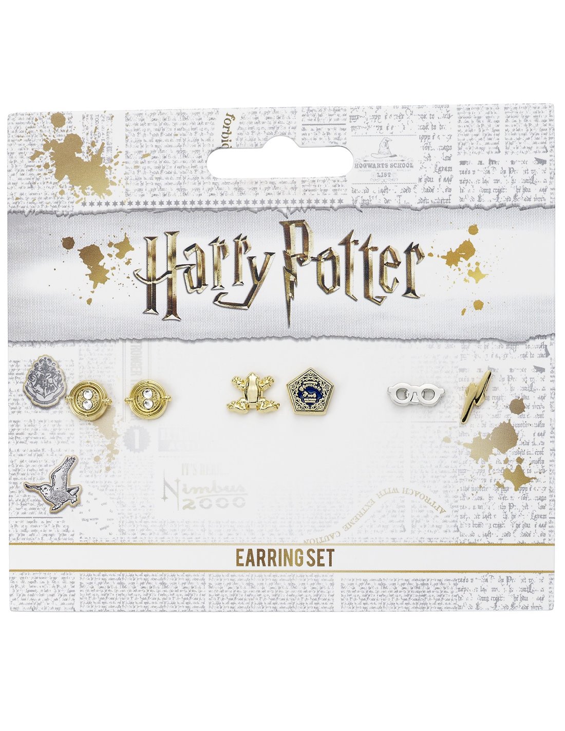Sarà difficile decidere quale paio di orecchini indossare dal nostro set di orecchini. Questo set di tre paia di orecchini è stato progettato pensando alle storie più popolari di Harry Potter. In questo set sono inclusi il Giratempo che Hermione usava per viaggiare nel tempo, la deliziosa rana di cioccolato e i famosi occhiali e la cicatrice del fulmine di Harry Potter. Questi orecchini vengono presentati nella confezione ufficiale del marchio Harry Potter. Ogni perno misura circa 7 mm per 7 mm. L'orecchino degli occhiali è placcato argento e le altre borchie sono placcate oro